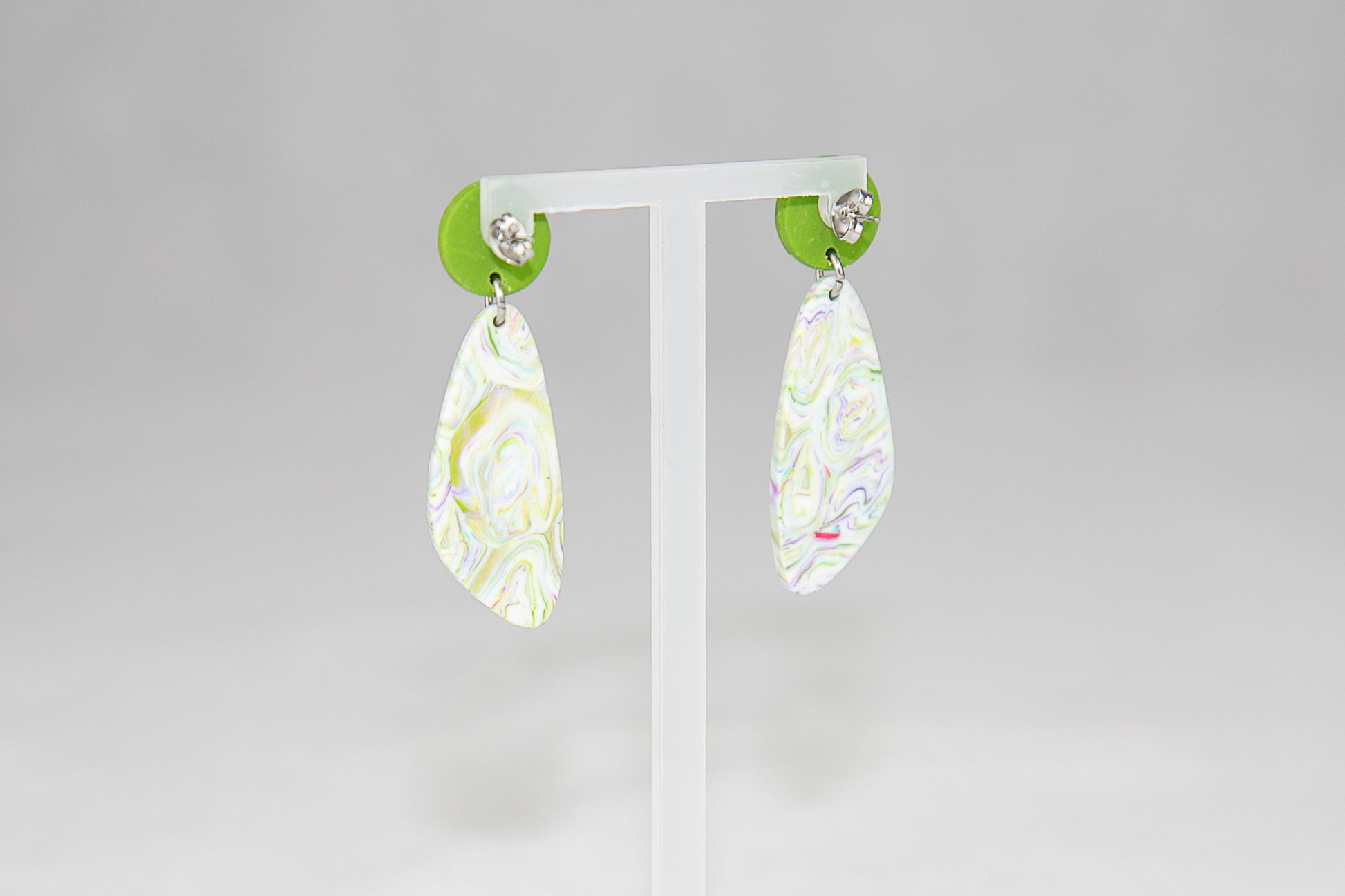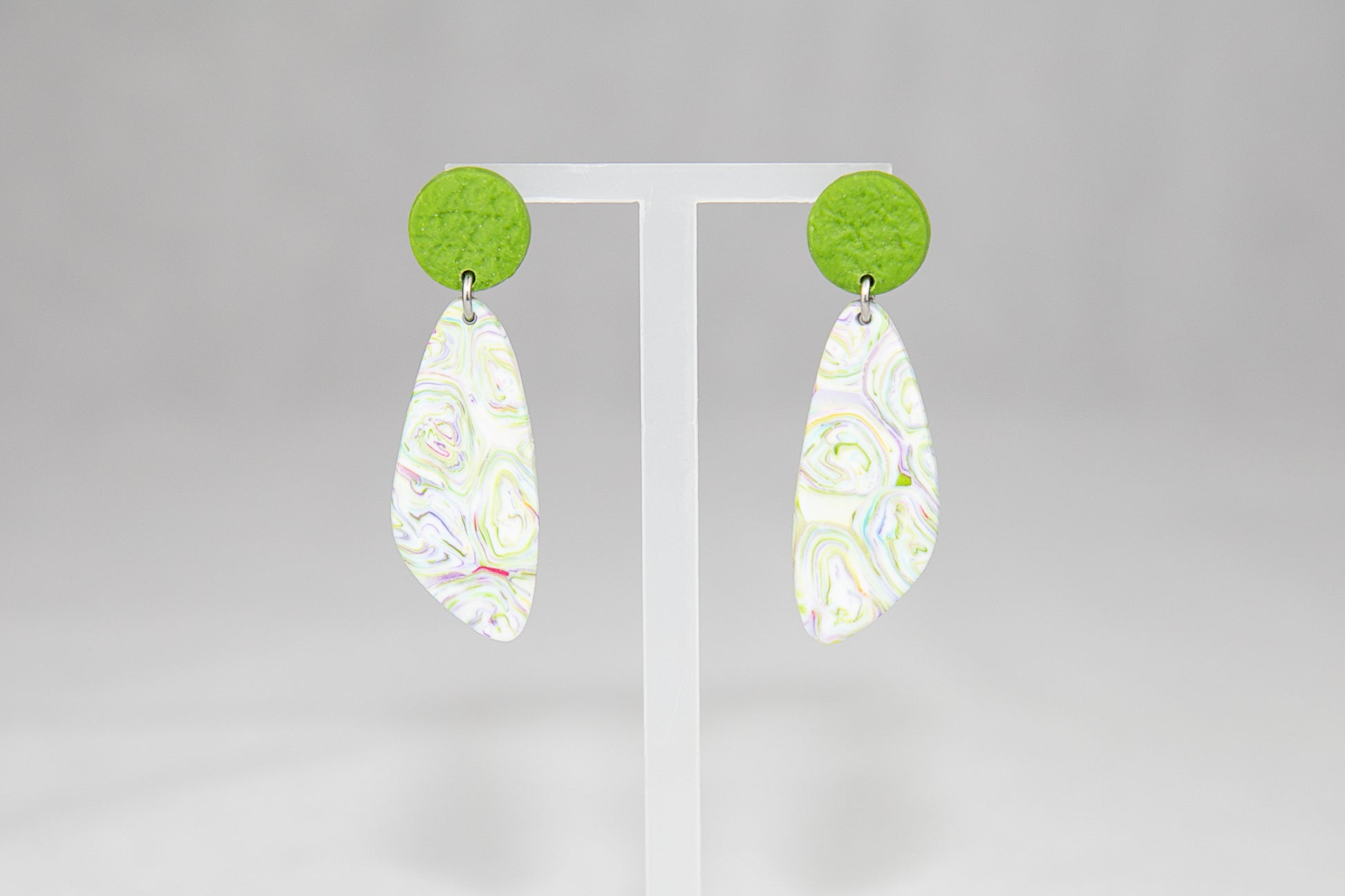 Boucles d'oreilles de forme géométrique avec un motif abstrait qui rappelle les cernes des arbres.