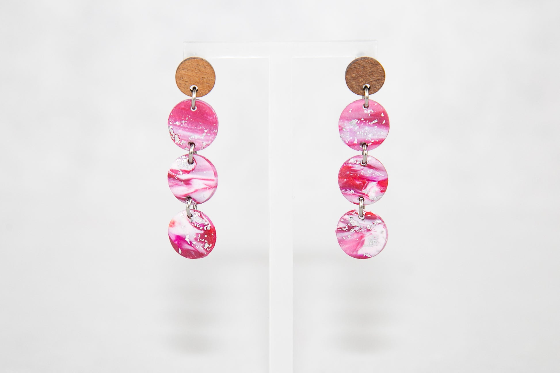 Boucles d'oreilles de forme géométrique, marbrées dans les tons rose, blanc et rouge.