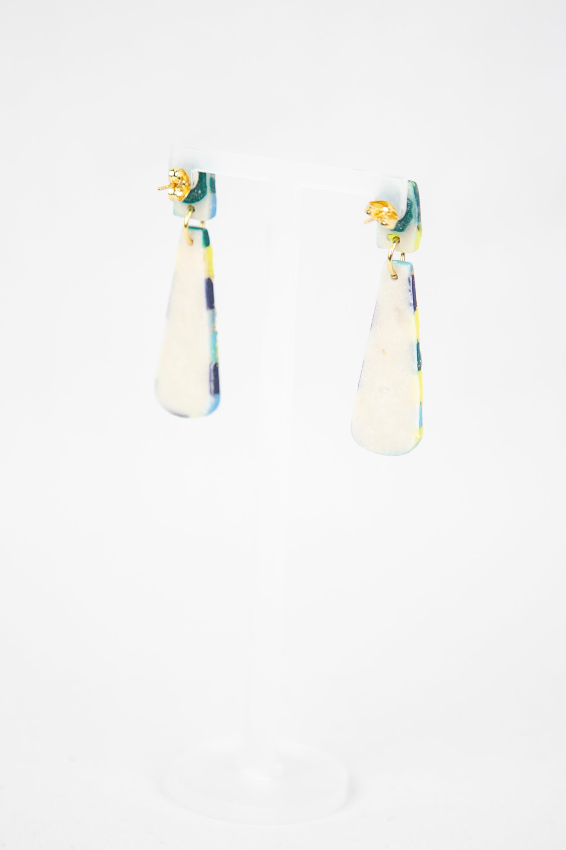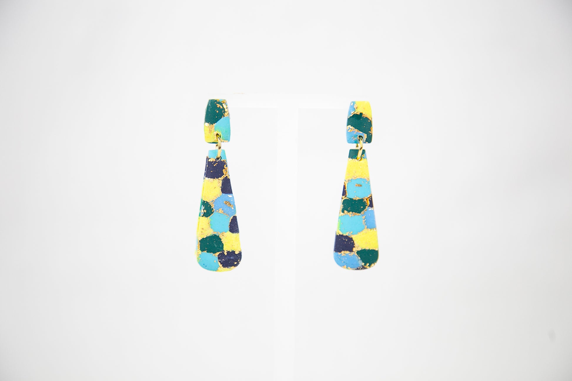Boucles d'oreilles en forme de goutte, dans les tons bleu, vert et jaune.