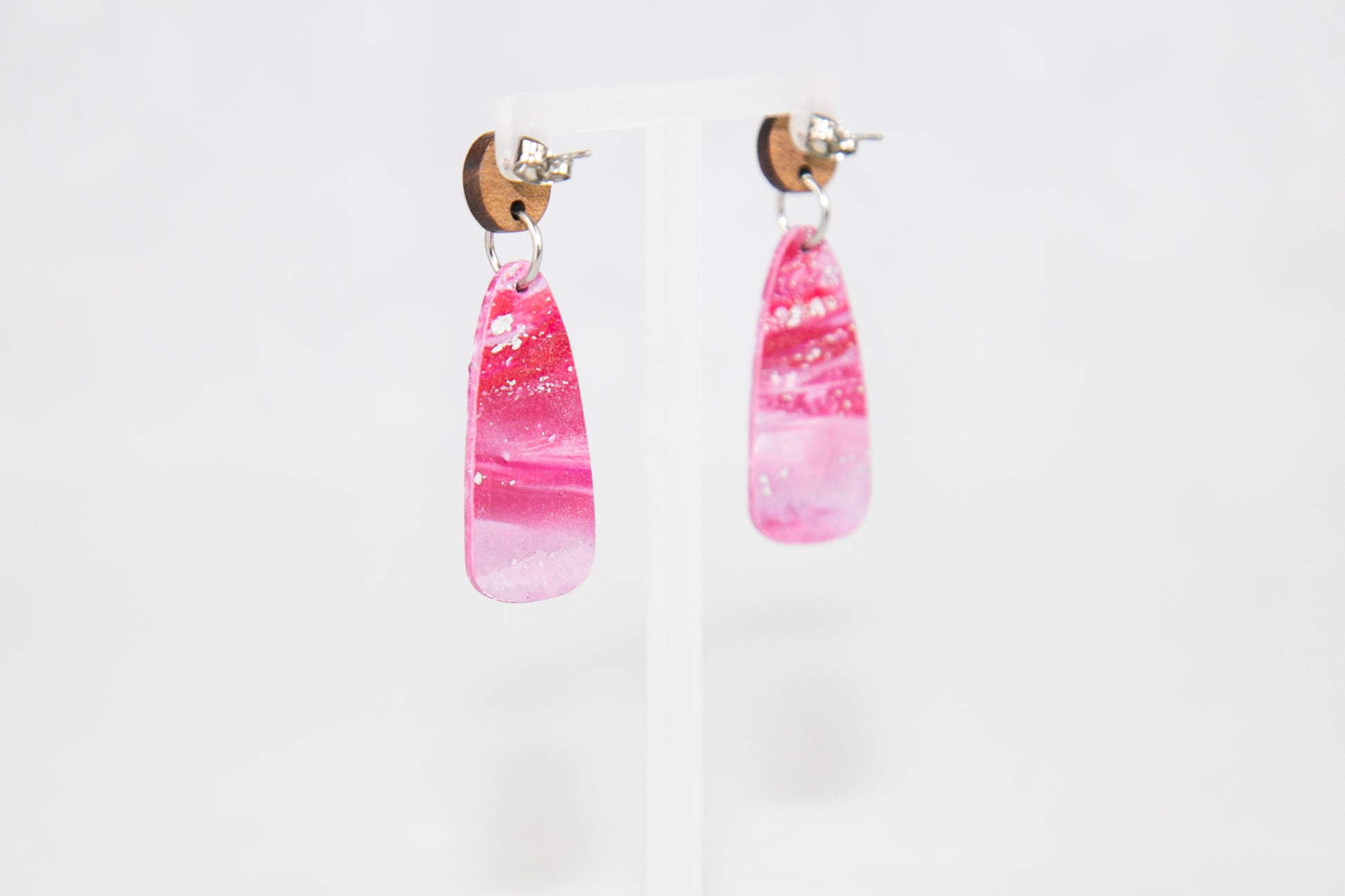 Boucles d'oreilles en forme de goutte, marbrées dans les tons rose, blanc et rouge.