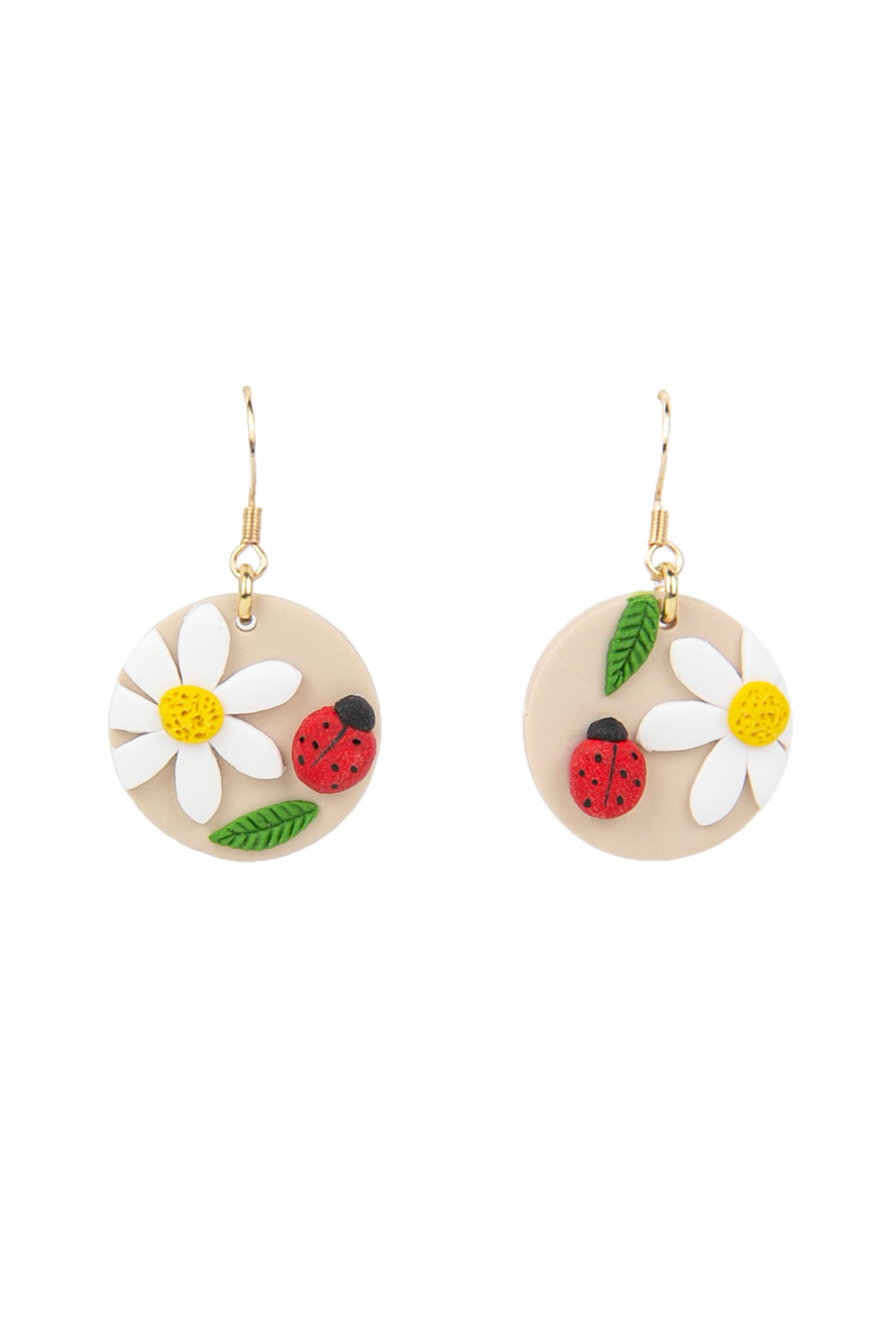 Boucles d'oreilles de forme ronde, agrémentées de fleurs et coccinelles. Ajoutez de la chance à votre journée!