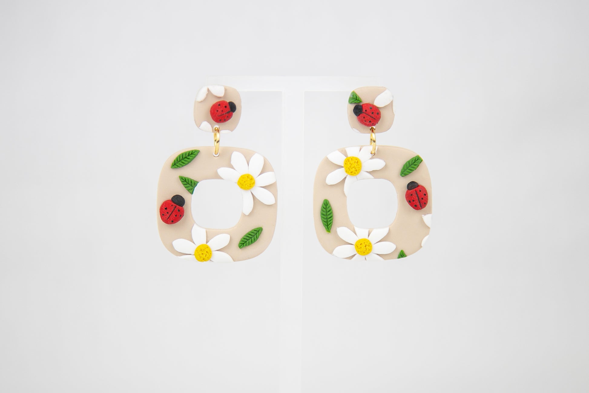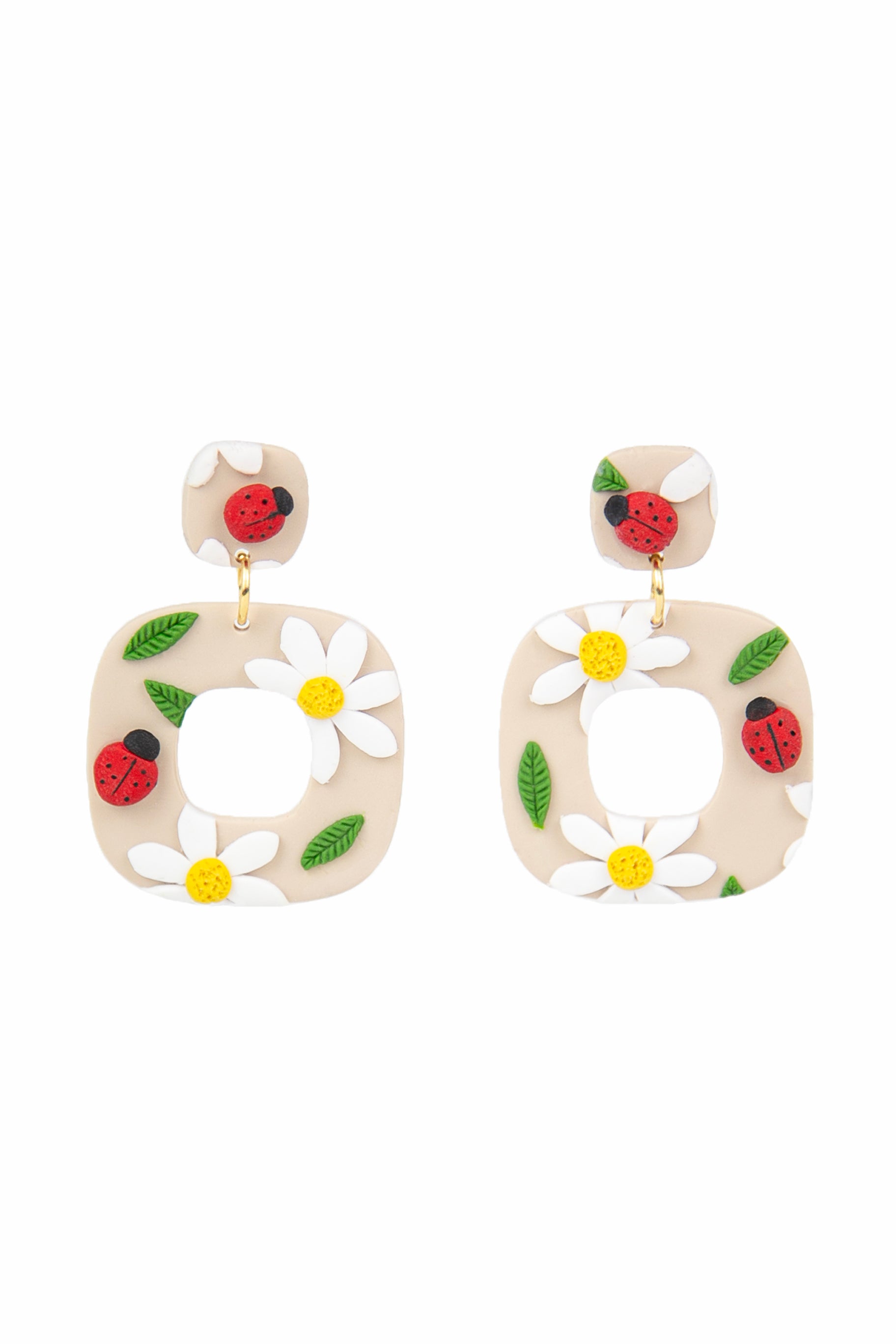 Boucles d'oreilles de forme géométrique, agrémentées de fleurs et coccinelles. Ajoutez de la chance à votre journée!