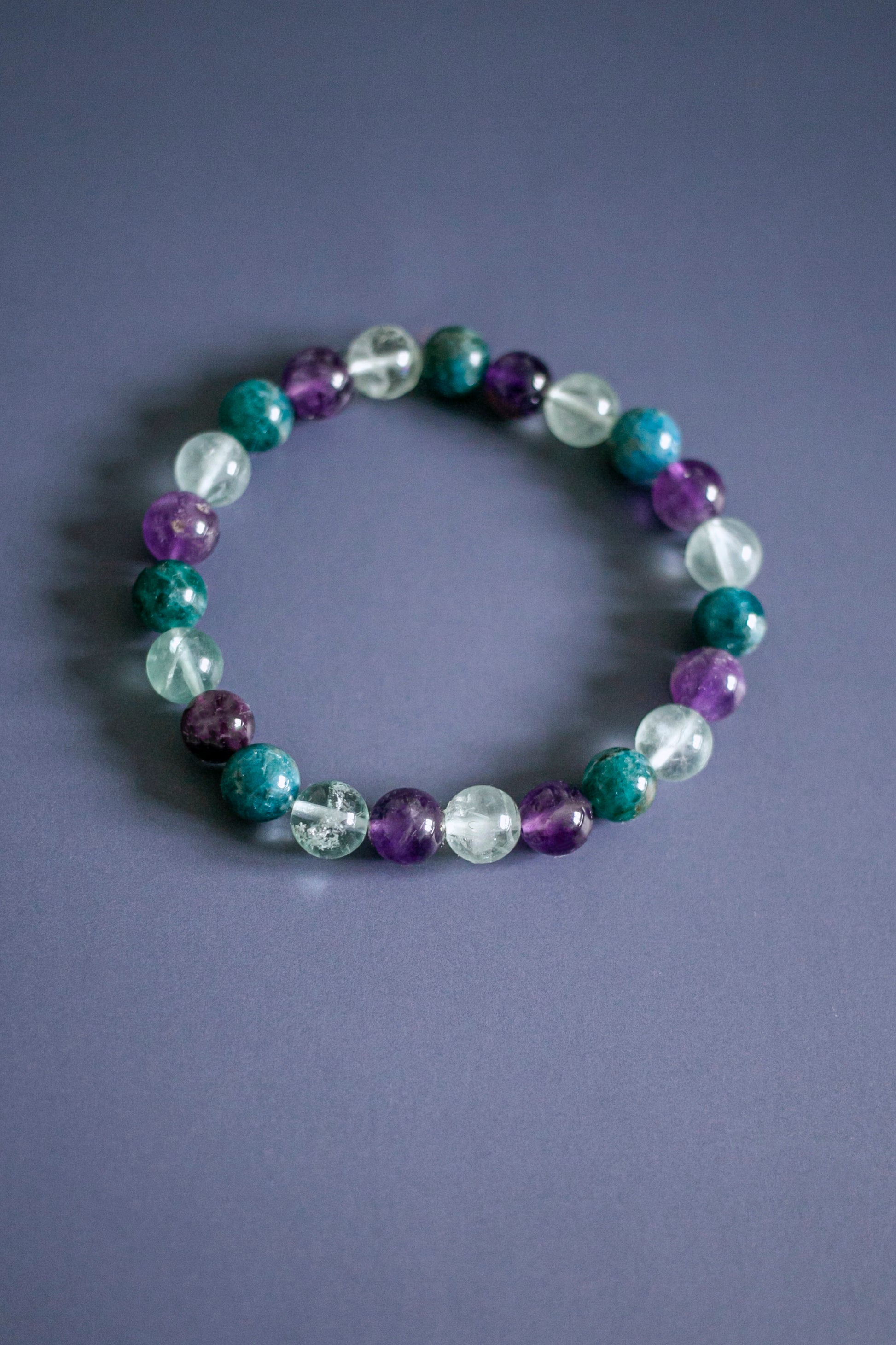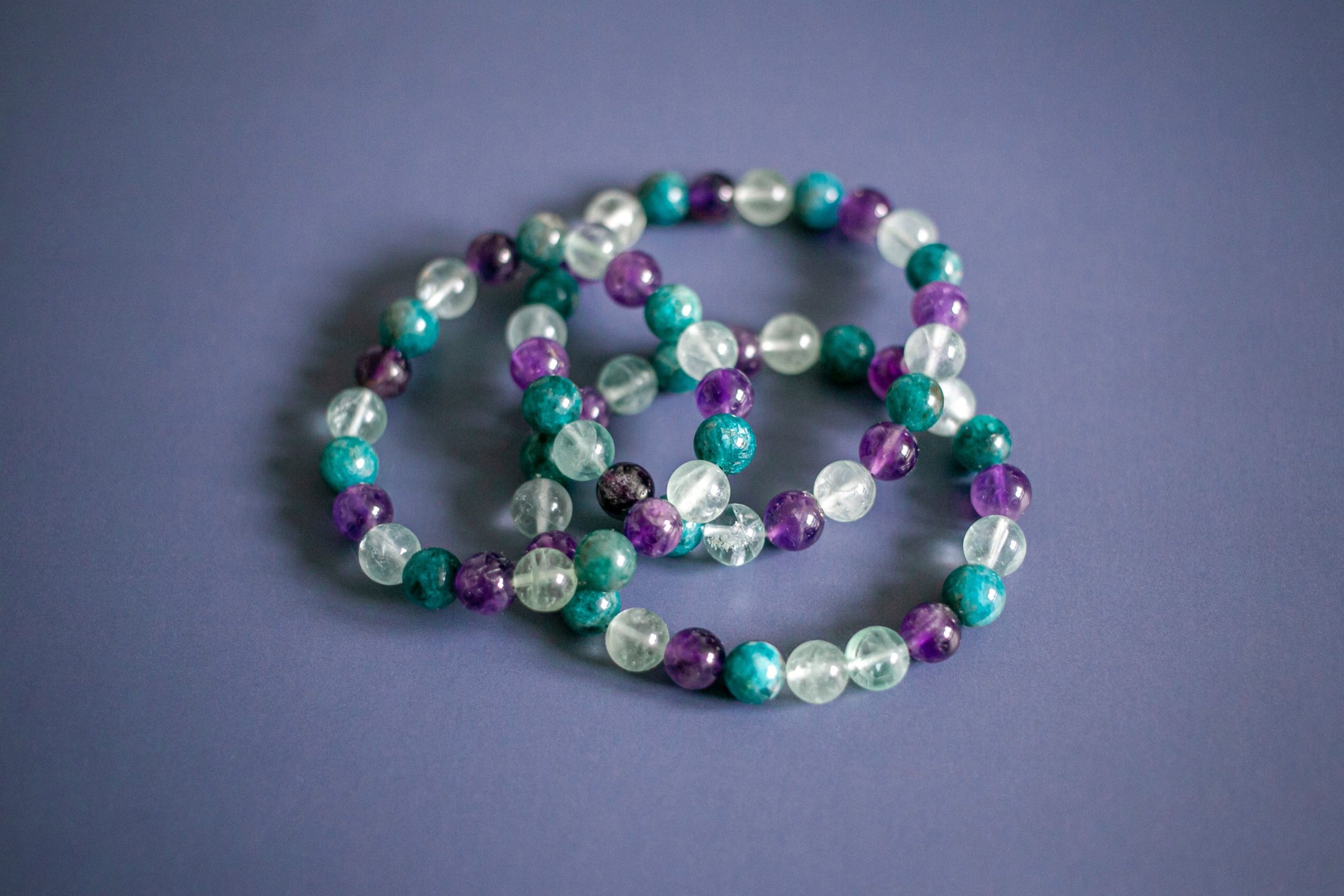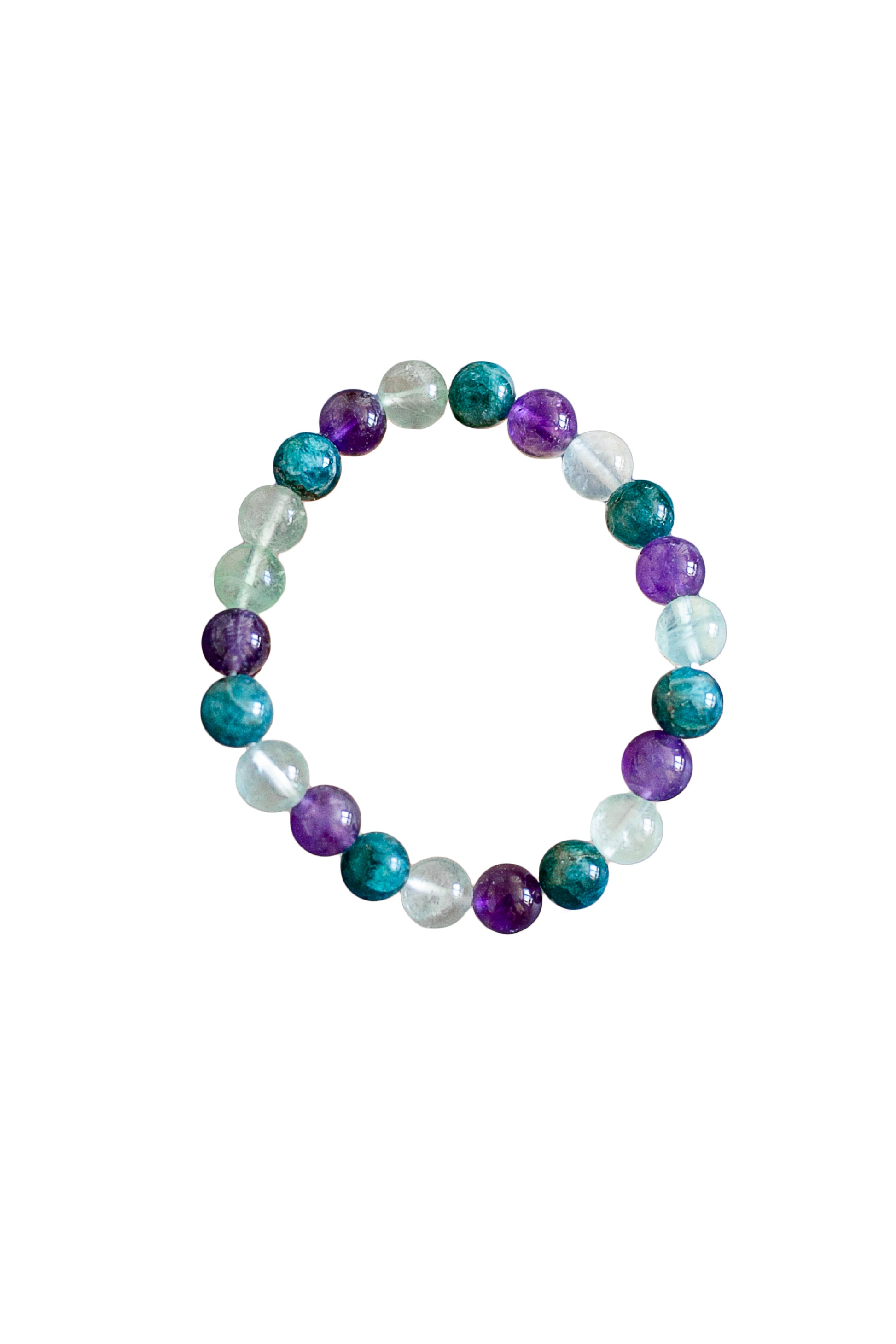 • Bracelet de 20cm: 8 perles en fluorite verte, 8 perles en améthyste, 8 perles en apatite bleue