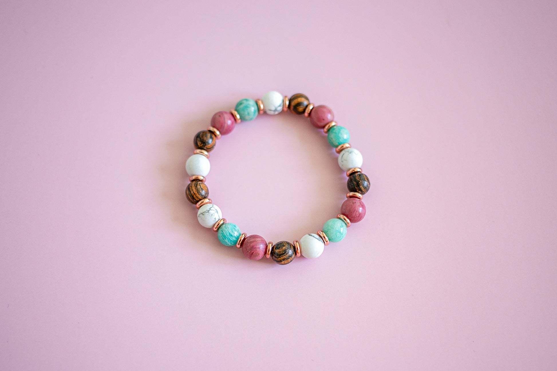 BRACELET AVEC DE LA HOWLITE, DE LA RHODONITE, DE L’AMAZONITE ET DU BOIS DE SANTAL