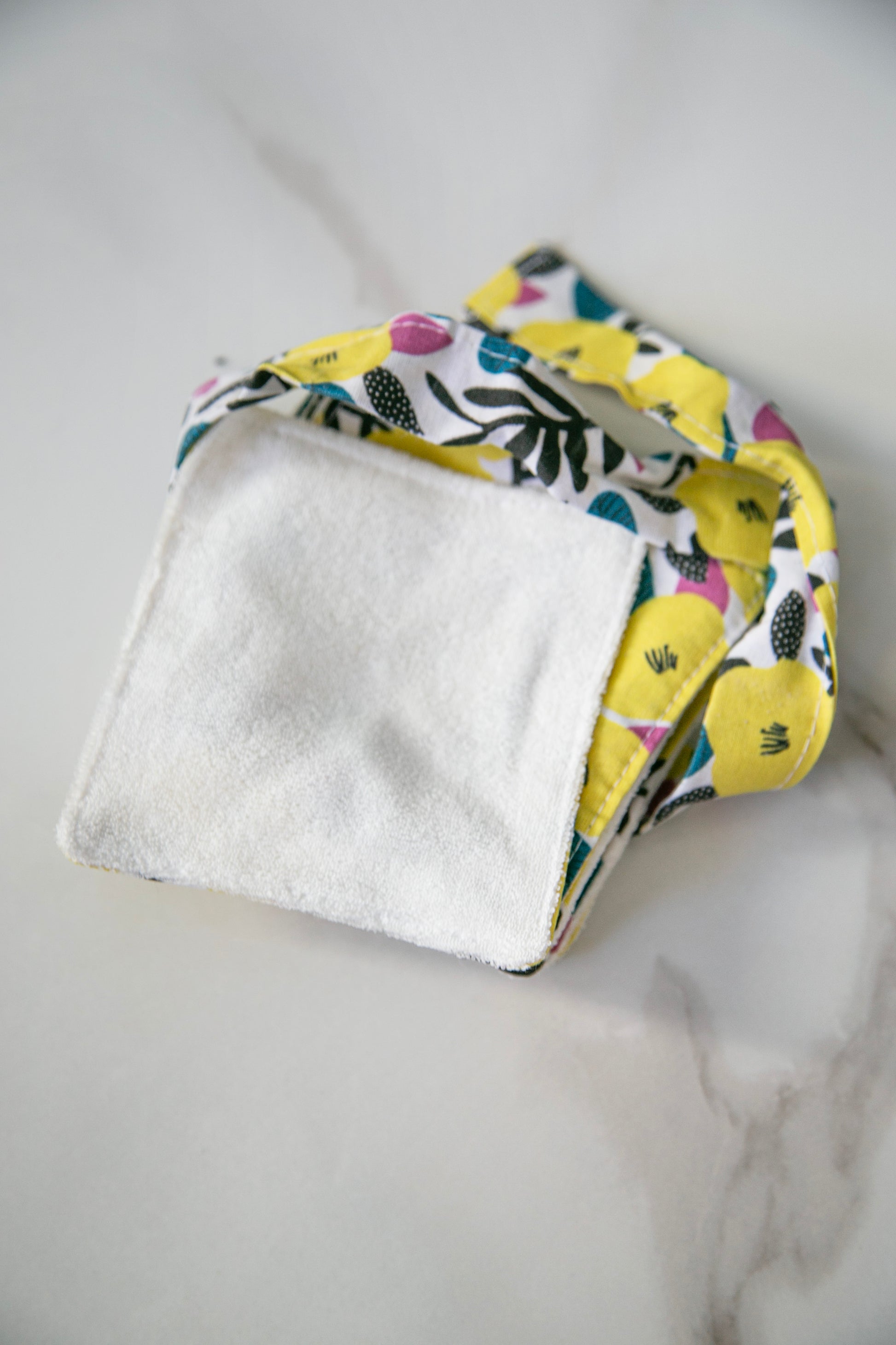 Les lingettes sont composées d'un côté en coton et d'un côté en fibre d'eucalyptus. Elles sont surpiquées pour une meilleure durabilité.