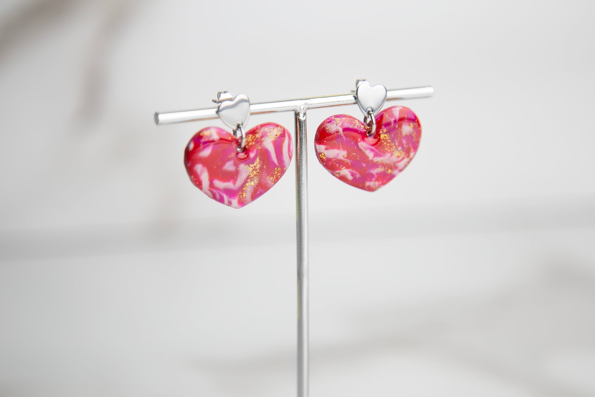 Boucles d'oreilles en forme de coeur, effet marbré dans les tons rouge, rose et blanc.