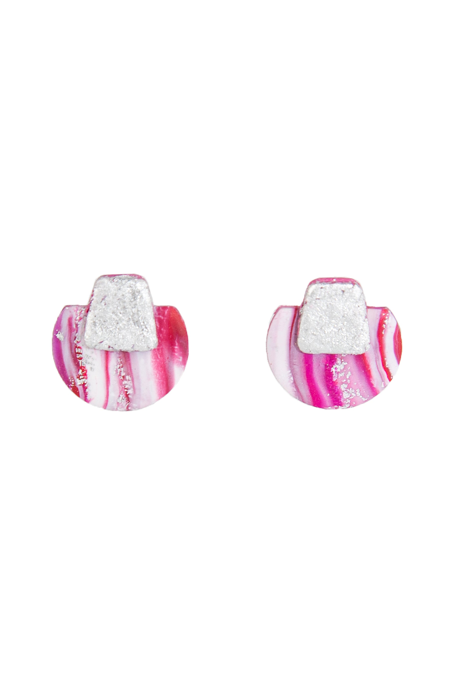 Boucles d'oreilles de forme géométrique, marbrées dans les tons rose, blanc et rouge.