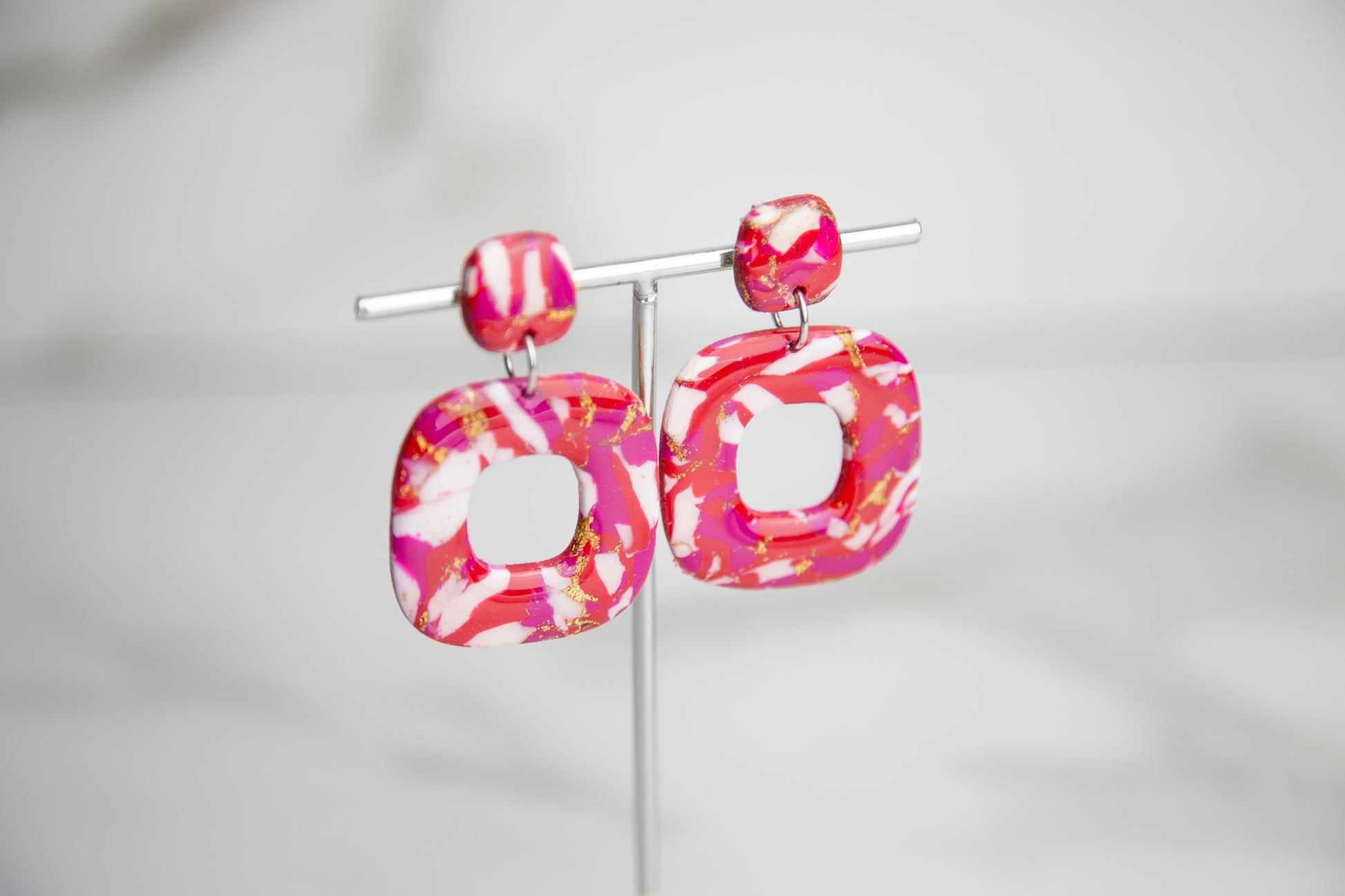 Boucles d'oreilles de forme géométrique, effet marbré dans les tons rouge, rose et blanc.