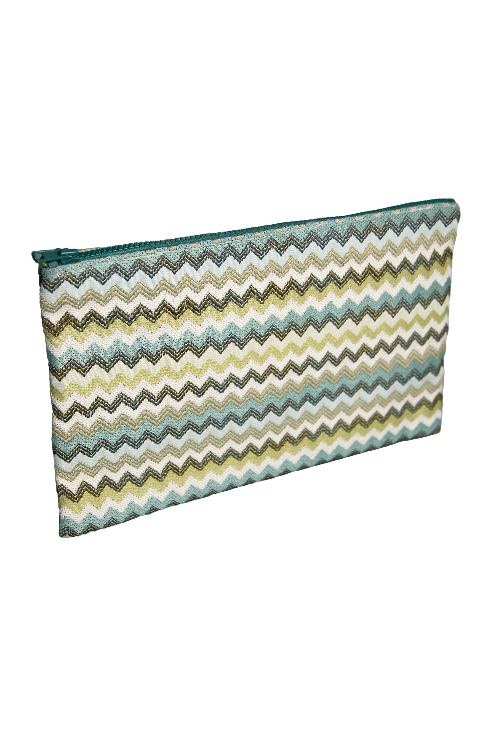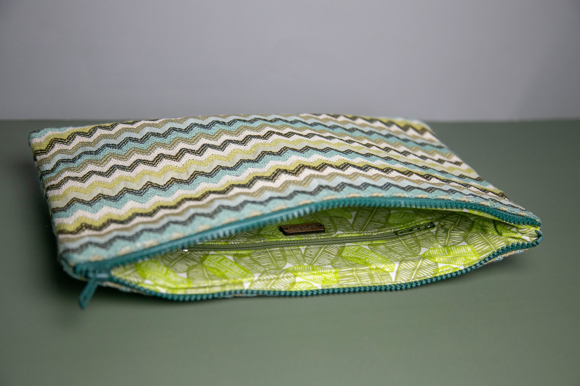 Pochette confectionnée avec du tissus épais (un tissu jacquard à l'aspect texturé) et un entoilage rigide pour un bon maintien. Le tissu extérieur et la doublure intérieure font l'objet d'une attention particulière. Les motifs et textures variés créés une combinaison harmonieuse, originale et unique.
