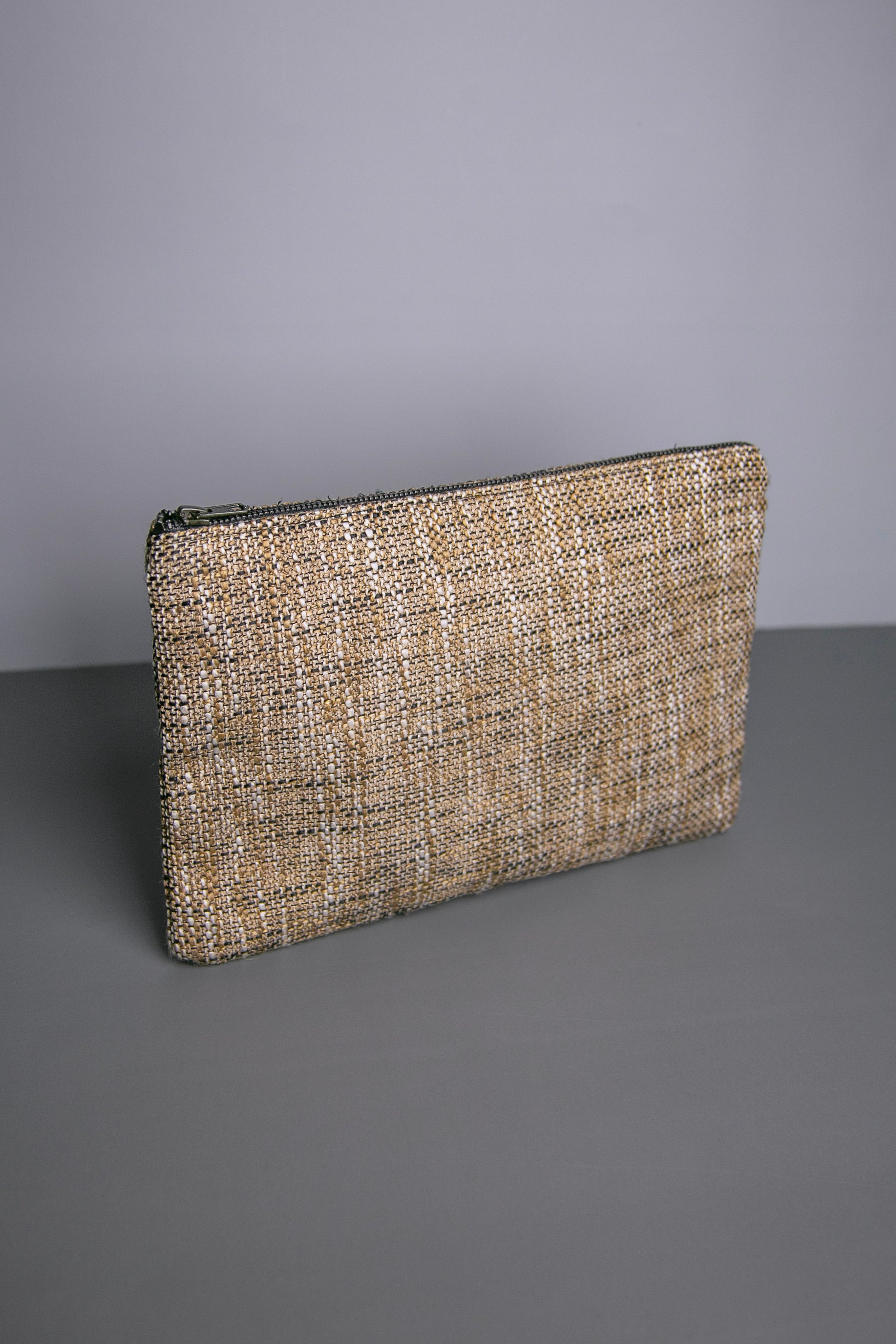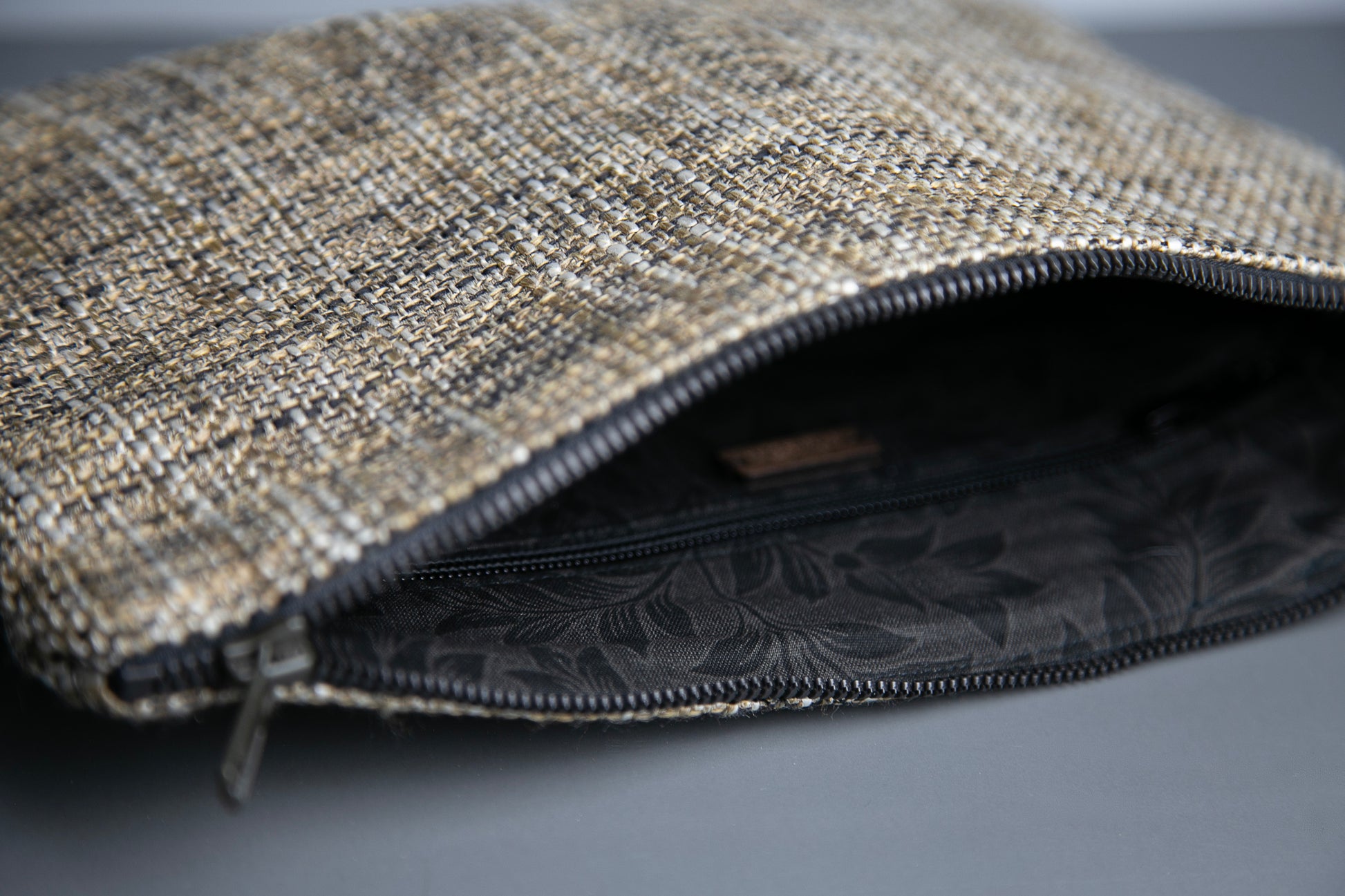 Pochette confectionnée avec du tissu épais (un tissu d'ameublement à l'aspect texturé) et un entoilage rigide pour un bon maintien. Le tissu extérieur et la doublure intérieure font l'objet d'une attention particulière. Les motifs et textures variés créés une combinaison harmonieuse, originale et unique.