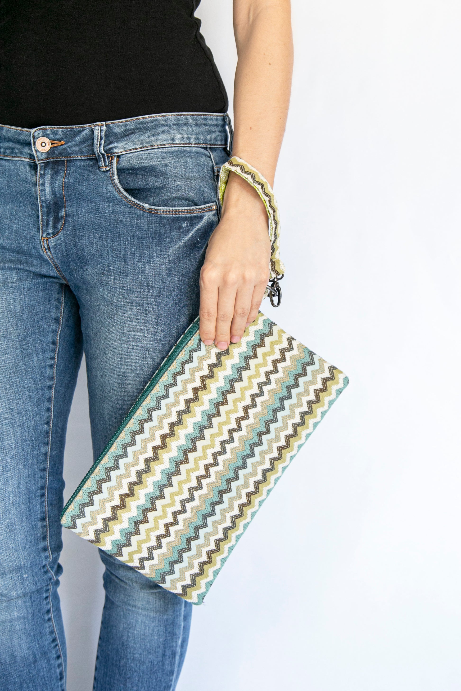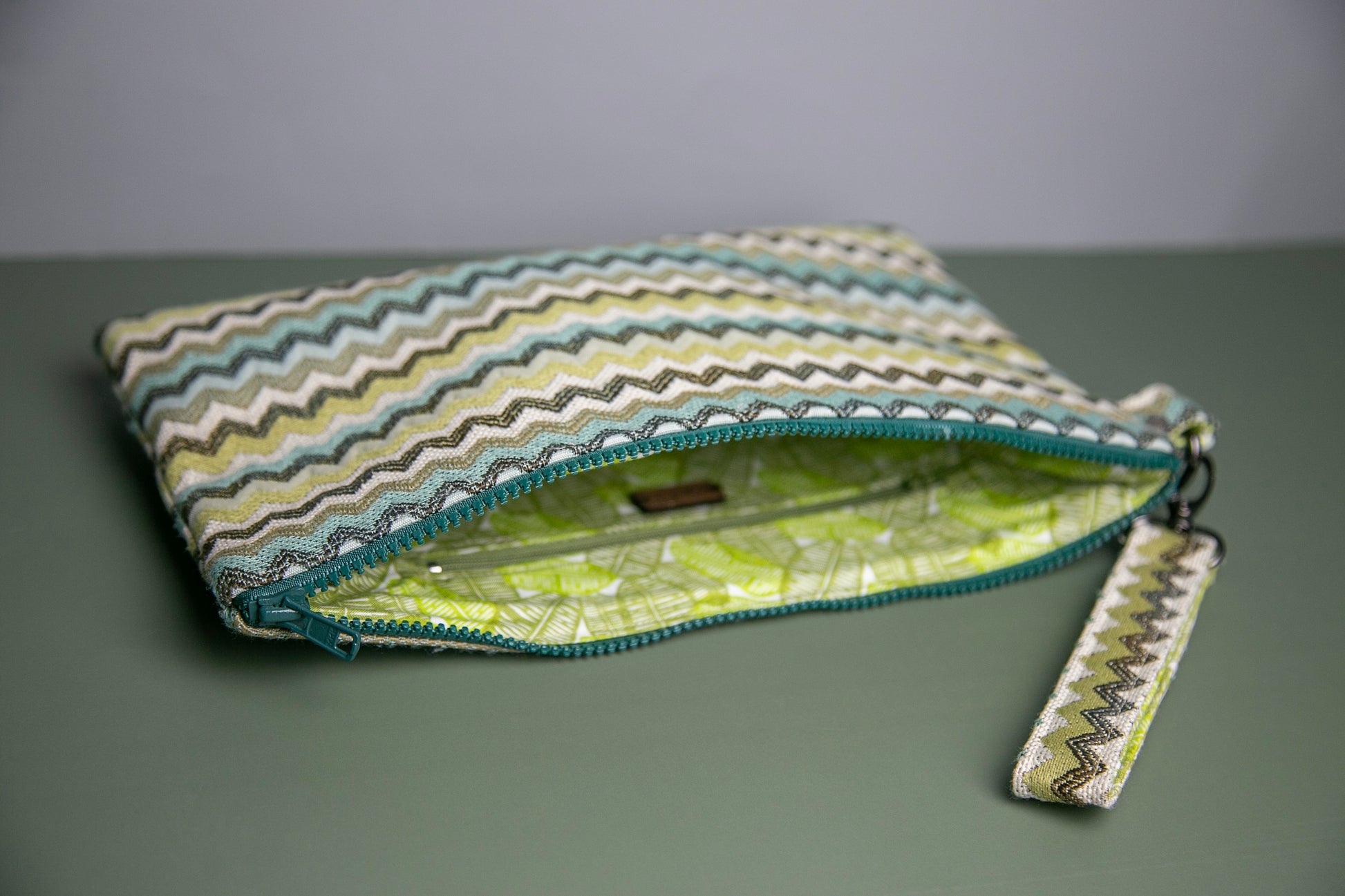 Pochette confectionnée avec du tissus épais (un tissu jacquard à l'aspect texturé) et un entoilage rigide pour un bon maintien. Le tissu extérieur et la doublure intérieure font l'objet d'une attention particulière. Les motifs et textures variés créés une combinaison harmonieuse, originale et unique.