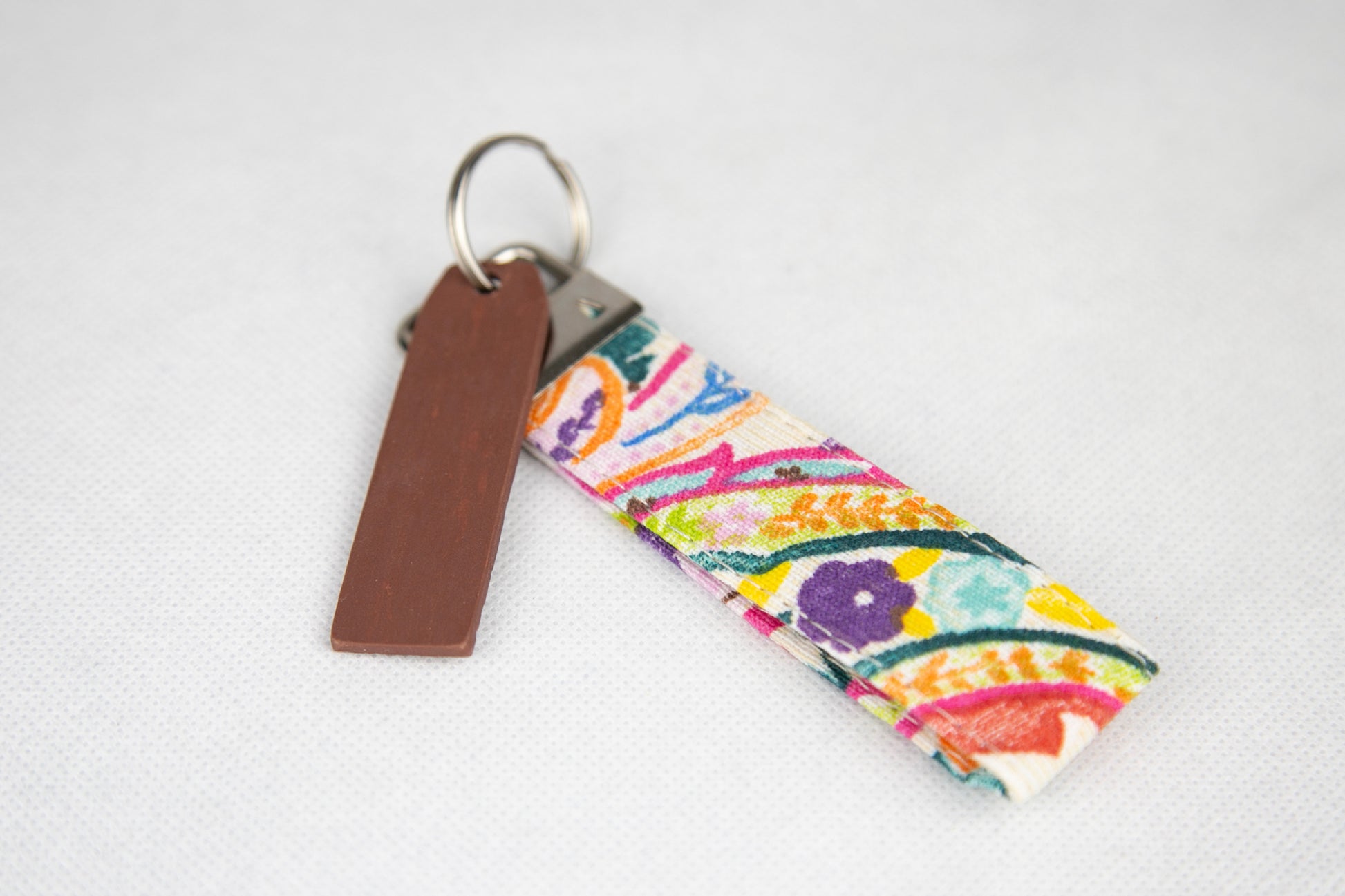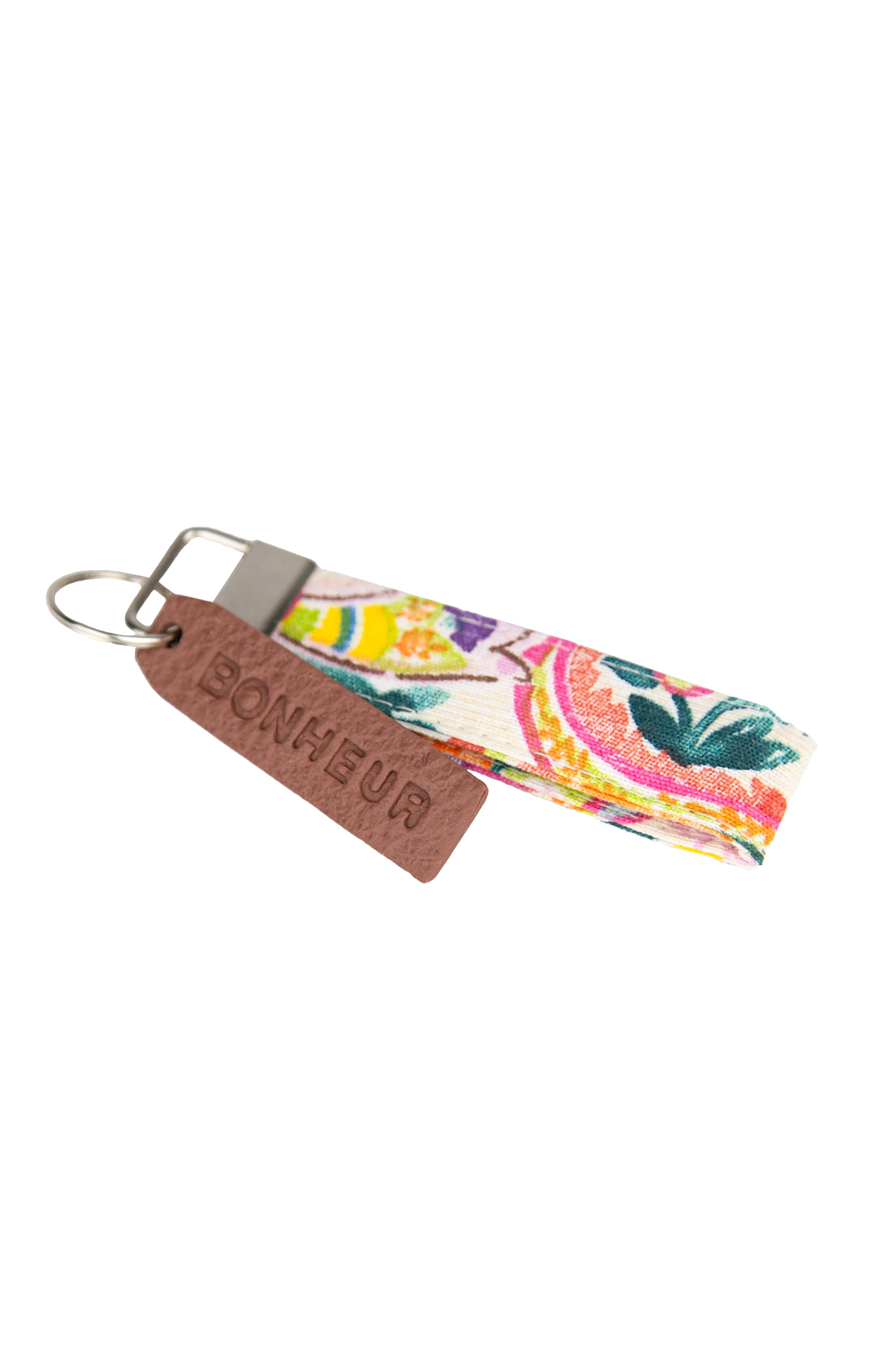 Porte-clés de 12cm en tissu et argile polymère à personnaliser. Un accessoire qui se mariera parfaitement avec les sacs de la collection Joie de vivre. Personnalisation jusqu'à 9 lettres.