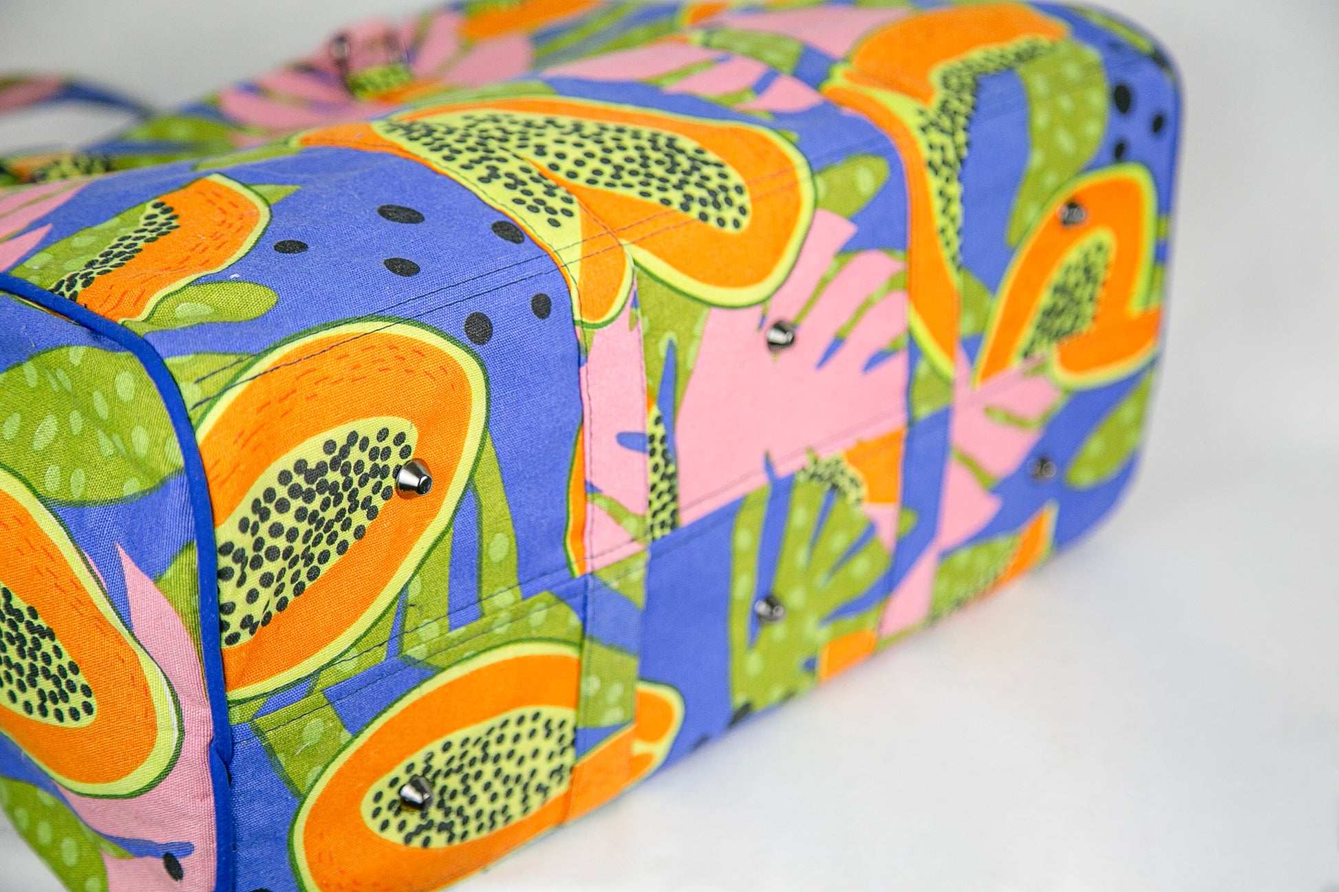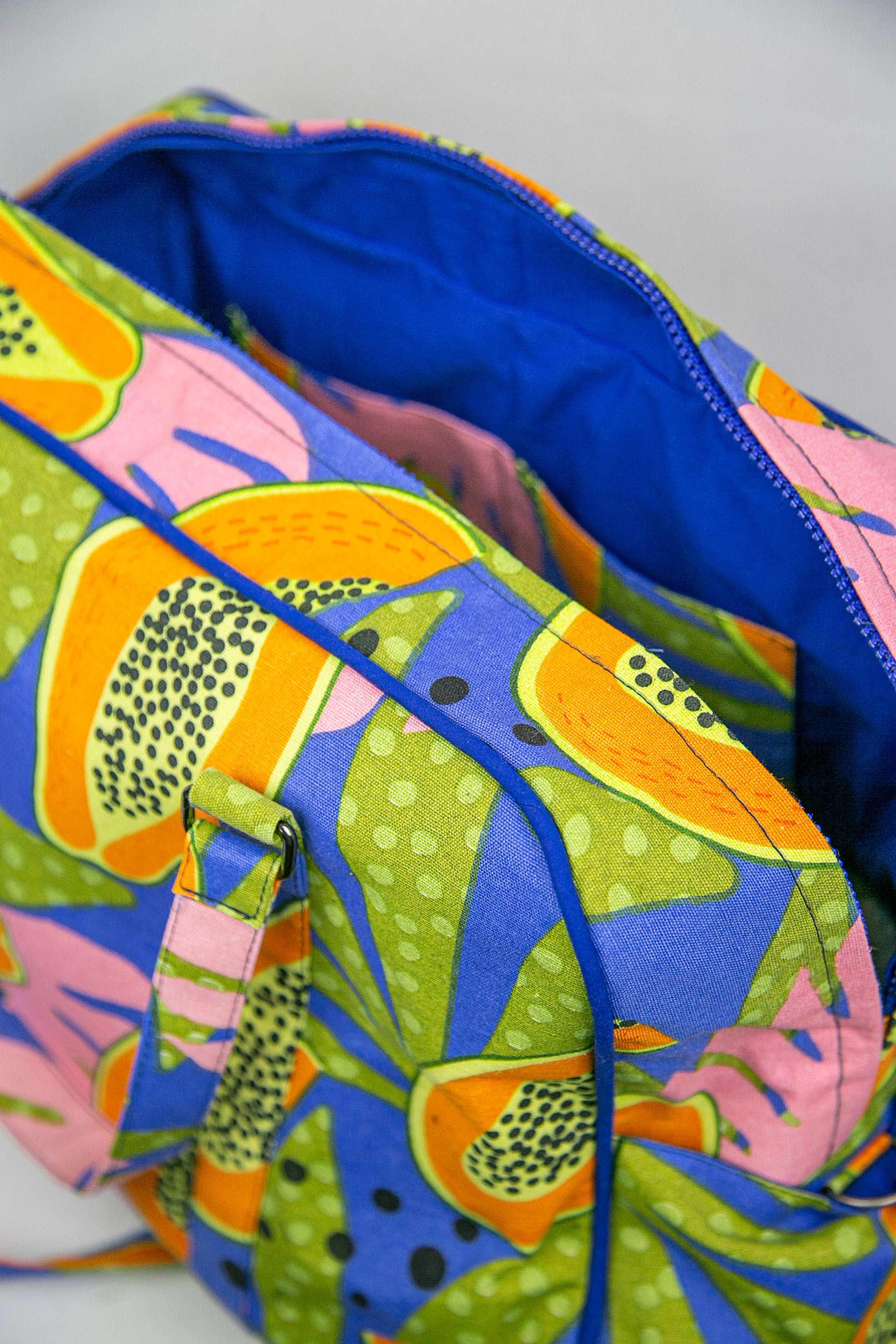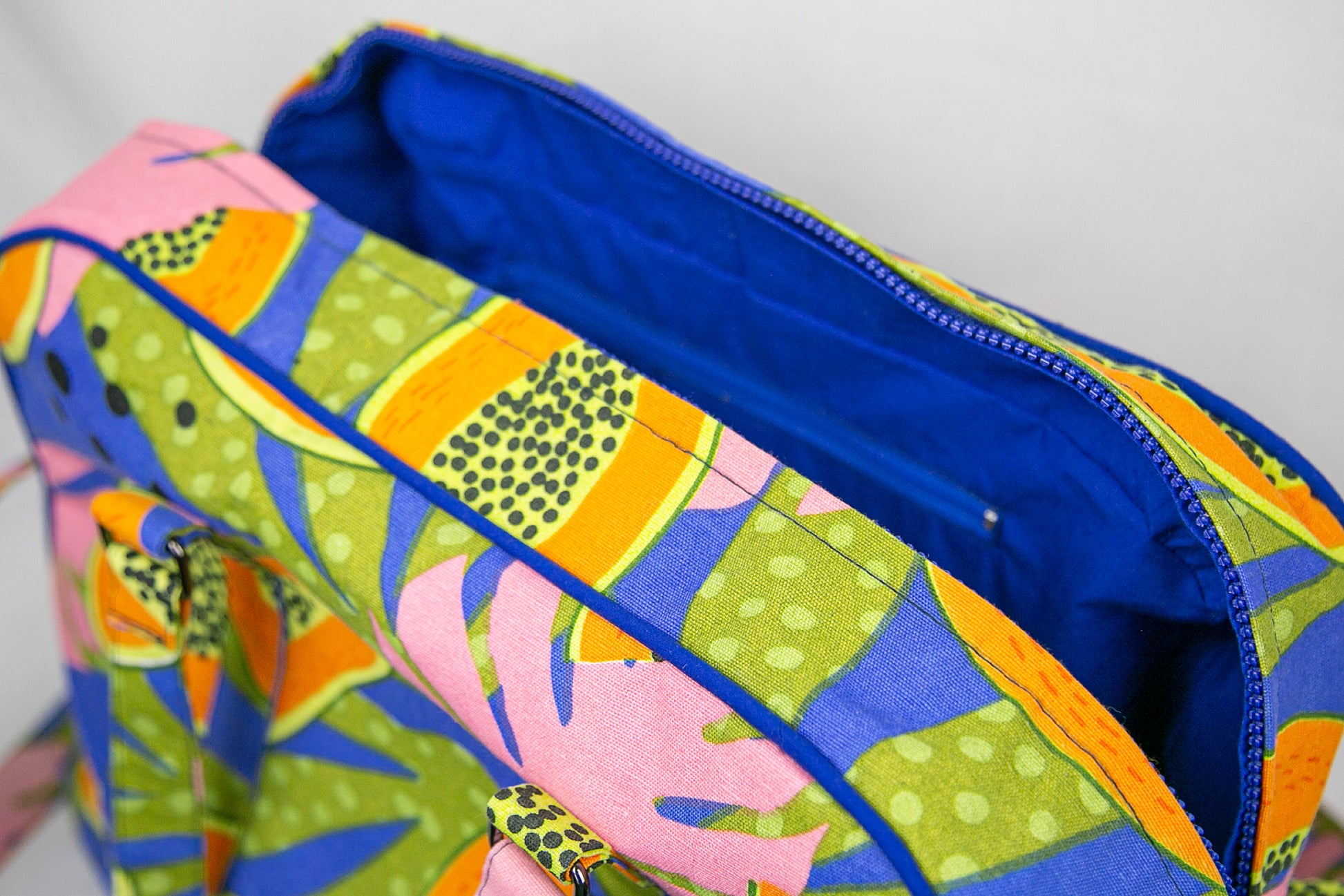 Sac confectionné avec du tissus épais et un entoilage rigide pour un bon maintien. Le tissu extérieur et la doublure intérieure font l'objet d'une attention particulière. Les motifs et textures variés créés une combinaison harmonieuse, originale et unique.